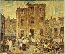 Spencer is known for his paintings of figures against a backdrop of factories and apartment houses, in an impressionist style with short, tight brushstrokes. The paintings he made in 1909–10 of the Pennsylvania mills and the women mill workers are considered his best.[4] He said, "A landscape without a building or a figure is a very lonely picture to me."[12] Well known works include The Silk Mill (1912), Grey Mills (1913), The Closing Hour (1913) and Repairing the Bridge (1913). The Metropolitan Museum of Art bought Repairing the Bridge in 1914.[3] His painting On the Canal, New Hope was acquired in 1916 by the Detroit Museum of Art. It depicts the back of run-down houses on the canal, with the lower portions whitewashed and bathed in light, with women doing housework.[13]