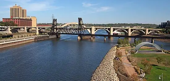 The Robert Street Bridge is a reinforced concrete multiple-arch bridge that spans the Mississippi River in downtown Saint Paul, Minnesota, United States. The bridge is notable for its complex design that was required to accommodate river traffic, the St. Paul Union Pacific Vertical-lift Rail Bridge crossing underneath it at an angle, and roadways on the downtown side of St. Paul. The bridge is also notable for a monumental reinforced concrete rainbow arch. The rainbow arch not only provides 62 feet of headroom above the river, but also provides a strong aesthetic focus. It was built in 1924–1926 by Fegles Construction Company, Ltd. and designed by Toltz, King & Day. The bridge was added to the National Register of Historic Places in 1989. The bridge as well as Robert Street itself are named after Captain Louis Roberts, a notable French Canadian river boat captain, businessman and early settler of Saint Paul, MN.