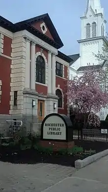In the early 1900s, Osman Warren, Rochester's postmaster, contacted Andrew Carnegie for help in securing an endowment to build the new library. The Carnegie Institute donated $20,000 to construct the new building. The new library was built on the site of what was the Main Street School. The library was built in the Georgian revival style, using brick and granite, and the inside was finished with golden oak and cypress.[7] The library opened on October 2, 1905, and 150 people registered the first day. Miss Lillian Parshley was the first librarian, serving until her death in 1945. Velma Foss, Miss Parshley's assistant, was the second librarian of the Rochester Library.[7]