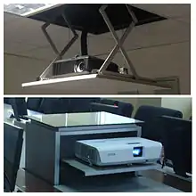 A roll-out shelf, also known as a glide-out shelf, pull-out shelf, sliding shelf, or slide-out shelf is a shelf that can be moved forward in order to more easily reach the contents stored in the back of a cupboard or cabinet without having to bend over.[1] They may also save space, as they can be installed closer together than fixed shelves.[2]