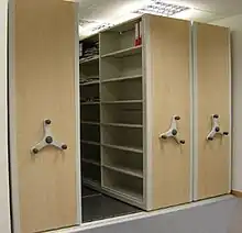 Mobile shelving, mobile aisle shelving, compactus, roller racking, or rolling stack, are terms applied to shelving or storage units fitted with wheeled traction systems. Units can be closely packed when access is not required, but can be readily moved to open up an aisle to allow access. By eliminating the need for a permanently open aisle between every unit, a smaller proportion of floor space can be allocated to storage than in the case of conventional fixed shelving, or a higher capacity of storage can be met using the same footprint as fixed shelving.