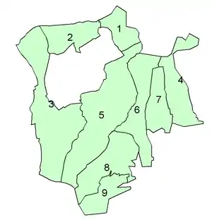 Before 1894 the urban part of Romford parish corresponding to the town was covered a local board of health. Under the 1894 legislation the parish was split with the former board of health district becoming the Romford Urban parish in Romford Urban District and the remainder formed the Romford Rural parish within the larger rural district. A parish council of nine members was formed for Romford Rural parish.[2] The arrangement did not last and in October 1896 the parish council resolved to seek amalagmation with Romford Urban. This was reciprocated by December 1898.[3] In 1900 the two parishes were abolished and their former area used to create a Romford parish which constituted the enlarged Romford Urban District.[4]