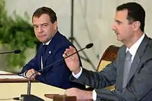 From October 2011, Russia, as a permanent member of the UN Security Council, repeatedly vetoed Western-sponsored draft resolutions in the UN Security Council that demanded the resignation of Syrian President Bashar al-Assad and that opened the possibility of United Nations sanctions against his government.[2][3] The Russian leadership rejects the demands of Western powers and their Arab allies that Bashar al-Assad should not be allowed to be a participant in the Syria settlement.[4][5][6] In January and February 2012, the opposition Syrian National Council[7] and the Western powers[8] dismissed Russian peace initiatives.