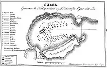 At about 11 a.m. of October 20 [O.S. October 8] a change of wind allowed Codrington to order the move into the harbor.[22] It was agreed that the English and Russian squadrons enter the harbor in parallel lines, followed by the French. At about 1 p.m. Codrington, cautious about the narrow entrance into the harbor, changed the plan and signaled orders to take formation in a single line.[23] The allied fleet took position in an arc side by side with the Turkish fleet. Azov headed to its planned position at the very center of the allied arc, with the rest of the Russian fleet to its port, the English and French battleships to its starboard, and the English frigates in the rear.[23] Soon the Turks fired at a British cutter, killing lieutenant Fitzroy and igniting an all-out naval battle.[24] Sources disagree on exact timing of events owing to different timekeeping practices and the confusion of the battle; the first shots were marked at either 2:00, 2:20 or even 2:45 p.m.; ship log of Azov recorded them at 2:30.[25] At this moment Azov was still on the move to its planned station and had just escaped the firing range of Turkish coastal artillery.[26] The smoke of English-Turkish shootout obstructed their view to starboard; Azov fired its first shots to port at 2:45.[27]