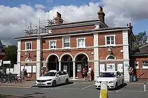 Construction of the station building began in 1847. It was designed by William Tress in symmetric Italianate style of two storeys with an attic in red brick with a slate roof and set of gateless gate pillars.[1][18] As Rye was planned to be a more significant stop than Appledore or Winchelsea, it was designed to be bigger than those. Tress also designed a goods shed in a similar style, sited alongside the main station building.[2]