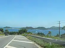 Two of São Sebastião's islands seen from the BR-101. As Ilhas are in the middle, and the Ilha das Couves can be seen to the right, right behind As Ilhas.