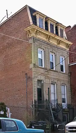 Set on a stone foundation, the house is built of brick and sandstone with an asbestos roof and elements of iron.[2] The sandstone is among the house's most distinctive components,[3] being used to cover the facade,[4]: 4 while the ironwork includes elements such as balustrades of wrought iron around the first-story windows and the cast iron used to create the main stairway to the house. The stairway is necessary for entry because of the house's elevated design: although it stands three stories tall, the first story is elevated high above the ground, and the basement is raised high enough that it can be entered from the street. Topping the building is a steep mansard roof featuring a trio of dormer windows, which are significant contributors to the house's general plan: like the sandstone facade, the roof and windows together are a critical component of the house's appearance, and the windows help to define the facade's three bays. Although the house's overall style is clearly Second Empire, the first and second story possess obvious Italianate influences.[3]