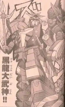 - Kokuryuu Daibujin (こくりゅうだいぶじん)- When forced to fight the combined form of Seirou and Sekijishi, Ryuunosuke provides Kokuryu with a Musha Nataku kit, which he combines with to form the gigantic Kokuryu Daibujin. This form takes advantage of the kits own Gigantic Musha Mode, with Kokuryu serving as the upper body and Nataku as the legs. The originally designed model kit version of this design included two further kits. The manga version uses only the Musha Nataku components, though increases their use by adding Nataku's shoulder armour and arms as further armour for the legs. Kokuryu also wields Nataku's large trident. Similar to the combination of Kokuryu and Hakuou, Kokuryu and Nataku's usual heads serve as shoulder armour whilst Kokuryu Daibujin has a head designer closer to that of Gundam tradition including a v-fin on the forehead.