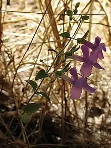 The plant twines along other plants or objects with its branchlets. It produces lavender snapdragon flowers 1 to 2 centimeters wide. The flower has a prominent lower lip and it may be streaked with darker purple. This species is most abundant in the low-elevation mountains of northern and central California, where it grows in rocky areas and especially in serpentine soil.
