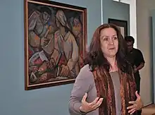 Cecilia Santacruz discussing a painting by Alfredo Zalce in background at the Origen de un Acervo event