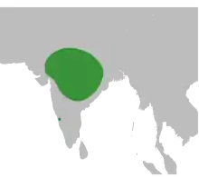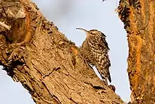 The African spotted creeper was formerly considered conspecific.[8] Together they were called spotted creeper. The Indian species is nowhere common but is found in locations scattered around parts of Rajasthan, Gujarat,[12] Haryana, Uttar Pradesh, central India (Bandhavgarh,[13] Jabalpur,[14] Bastar district[15][16]) Orissa,[17][18] northern Andhra Pradesh (Adilabad,[19] Kawal Wildlife Sanctuary[20]). In the past the slightly paler plumaged population in the arid zone of the Aravalli hills was separated as a subspecies rajputanae by Richard Meinertzhagen (and his wife)[21] but this is treated as part of a single population and combined into a single (nominate) subspecies.[4]