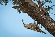 The Indian spotted creeper (Salpornis spilonota) is a small passerine bird, which is a member of the subfamily Salpornithinae which is placed along with the treecreepers in the family Certhiidae. This small bird has a marbled black and white plumage that makes it difficult to spot as it forages on the trunks of dark, deeply fissured trees where it picks out insect prey using its curved bill. It is found in patchily distributed localities mainly in the dry scrub and open deciduous forests of northern and central peninsular India. It does not migrate. Their inclusion along with the treecreepers is not certain and some studies find them more closely related to the nuthatches while others suggest a close relation to the wallcreeper. They lack the stiff tail feathers of treecreepers and do not use their tail for supporting them while creeping vertically along tree trunks.