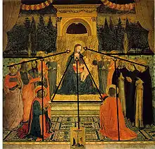 The San Marco Altarpiece depicts a portrait of the Virgin and Child seated on a throne surrounded by saints and angels. The formal elements are innovative for a contemporary Virgin and Child altarpiece as the positioning of the characters creates a deeply receding and logical space in front of the landscape background. The pomegranate embroidered curtain behind the Virgin and Child establishes a distinct horizontal line separating the events depicted in the painting from the landscape behind it. The altarpiece is situated on the then newly invented single rectangular panel, which helps turn a typical easel painting into the principal image of the altarpiece.[8] Representing the figures set within a coherent pictorial space was also a new technique Angelico employed.[3] While partially covered by the saints and angels, there is a definite line created by the carpet's receding squares in the foreground adding depth to the painting. Angelico's use of space is exceptional as he creates a sense of balance on both sides of the Virgin and Child, but also leaves available space on the carpet approaching the Virgin and Child so the viewer does not feel blocked or overwhelmed. This symmetry and order would allow worshippers to clearly view the painting from afar.