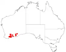 Scaevola argentea is endemic to Western Australia and found between Ravensthorpe and Ongerup. It grows in sandy heaths.[3] [5]