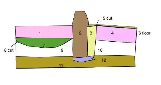 Sections may also be employed in excavation in temporary fashion as a form of stratigraphic control so as to ascertain the relationship between two or more contexts which may be better examined by the use of a section. Then once a relationship is established contexts can be removed from site in the reverse order they arrived in accordance with the stratigraphic excavation and the creation of a Harris matrix for the sequence being investigated.[1] It is up to the archaeologist on site to determine the best local on site strategy for excavating deposits, be it "in section" or "in plan". In this regard the modern archaeologist uses sectioning as a tool for understanding the site stratigraphically during excavation rather than as an end goal in recording it. These caveats aside sections remain a powerful tool for archaeological investigation. A revival of digging in section with machines has occurred in recent years by a proliferation of limited time constrained development led excavations.