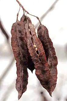 Sesbania punicea (Spanish gold, rattlebox, or scarlet sesban) is an ornamental shrub with reddish-orange flowers. It has deciduous leaves and grows to a height of 15 feet (4.5 m). This plant has a high demand for water, and thrives in swamps or wet areas. It requires a mildly acidic soil, with a pH between 6.1 and 6.5.[2][3]
