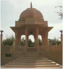 "…it is extraordinarily beautiful with great carvings and decoration. It is a chhatri composed of 12 pillars and on elaborated carved dome.The sthal is fronted with right of steps. The porch has an extended verandah. The dowar of the dome has relief recessed niches. The finial is beautiful and topped with Kalash."
