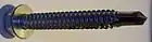 | concrete screw Tapcons masonry screw Confast screw multi-material screw blue screw self-tapping masonry screw Titen | A stainless or carbon steel screw for fastening wood, metal, or other materials to concrete or masonry. Concrete screws are commonly blue in color, with or without corrosion coating. They may either have a Phillips flat head or a slotted hex washer head. Nominal (thread) sizes range from 0.1875 to 0.375 in (4.763 to 9.525 mm) and lengths from 1.25 to 5 in (32 to 127 mm). Typically an installer uses a hammer drill to make a pilot hole for each concrete screw and a powered impact driver to drive the screw. The drill hole should be 1/2" longer than the depth penetration of the screw. The screw itself should be drilled a minimum of 1" into the concrete to hold effectively and a maximum of 1-3/4" or the threads will wear and will lose holding power. Ideally 1-1/4" to 1-1/2" of screw thread in the concrete.[1] So for example, if a 1/2" board is being screwed onto the concrete, a 1-3/4" to 2" concrete screw should be used. | ||