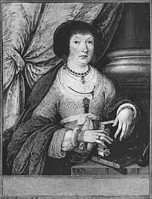For several years, she kept up a correspondence with Madeleine de Scudéry and Johannes Valentinus Andreae. Sibylle Ursula wrote part of a novel, Die Durchlauchtige Syrerin Aramena (Aramena, the noble Syrian lady), which when complete would be the most famous courtly novel in German Baroque literature; it was finished by her brother Anthony Ulrich and edited by Sigmund von Birken.[3][4] Other writings of hers include a five-act play and a series of spiritual meditations.[4] Translations of hers include two novels (Cassandre and Cléopâtre) by La Calprenède, parts of Scudéry's Clélie, and Introductio ad sapientiam, one of the Latin writings of Juan Luis Vives, a Spanish humanist.[2][4]