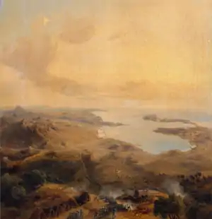 Lángara ordered Don Pedro Cotiella to take three boats into the arsenal to destroy the French fleet. Sir Sidney Smith, who had recently arrived, volunteered to accompany him with his ship Swallow and three British boats. Cotiella was tasked with sinking Toulon's hulks; one was a disarmed former British frigate captured during the American Revolutionary War, Montréal, and the other was the French frigate Iris.[12] These ships contained the gunpowder stores for the entire fleet and due to the danger of explosion were anchored in the outer roads, some distance from the city. He was then instructed to enter the Old Arsenal and destroy the ships there. The dock gates had been barred against attack and manned by 800 former galley slaves freed during the retreat. Their sympathies were with the advancing Republicans so to ensure that they did not interfere, Smith kept his guns trained on them throughout the operation.[13] His boats were spotted by the Republican batteries on the heights and cannonballs and shells landed in the arsenal, although none struck Smith's men. As darkness fell Republican troops reached the shoreline and contributed musketry to the fusillade; Smith replied with grapeshot from his boats' guns.[14] At 20:00 Captain Charles Hare brought the fire ship HMS Vulcan into the New Arsenal. Smith halted the ship across the row of anchored French ships of the line, and lit the fuses at 22:00. Hare was badly wounded by an early detonation as he attempted to leave his ship.[15] Simultaneously, fire parties set alight the warehouses and stores ashore, including the mast house and the hemp and timber stores, creating an inferno across the harbour as Vulcan's cannons fired a last salvo at the French positions on the shore.[16] With the fires spreading through the dockyards and New Arsenal, Smith began to withdraw. His force was illuminated by the flames, making an inviting target for the Republican batteries. As his boats passed the Iris, however, the powder ship suddenly and unexpectedly exploded, blasting debris in a wide circle and sinking two of the British boats. On Britannia all of the crew survived, but the blast killed the master and three men on Union.[17]