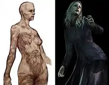 Like all Silent Hill games, one of Silent Hill 3's influences is the film Jacob's Ladder:[23] one of the subway platforms is named Bergen Street Station, the station Jacob was inquiring about at the beginning of the film.[3] The developers also cited horror writer Stephen King as another of their influences.[23] Silent Hill 3 incorporates references drawn from real-life actors and actresses. Douglas Cartland's name came from American actor Douglas Fairbanks.[26] The developers stated that his name "just seemed to suit him" and that there was no true connection to his namesake. During the sketching process, his character was modeled after actors Giancarlo Giannini and Ian Holm.[26] It was noted even during the concept designs that Cartland was designed as a middle-aged detective. Claudia Wolf's character was considered the most difficult to design.[26] Early sketches revealed that the creators wanted to dress her like a holy woman, and at one point she had a shaved head, with her body covered with tattoos, however, the creators thought that this way of showing her malevolent side was too obvious.[26] Eventually, the creators decided to model her on Julianne Moore, and then remove her eyebrows, so that the appearance was slightly skewed.[26] She was first named "Christie", but it was deemed too "cute" and the character was eventually named after Italian actress Claudia Cardinale.[26] Vincent's name originated from actor Vincent Gallo in connection with his unshaven look.[26] Early designs were based on actor Ethan Hawke and focused on capturing a look of "derangement and moodiness."[26]