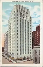 The Sinclair Building (originally the Dulaney Building) is a Zigzag Moderne skyscraper in downtown Fort Worth, Texas. Located on the west corner of Fifth and Main street, the 200-foot-tall, sixteen-story tower neighbors fellow Art Deco landmarks the Kress Building and Blackstone Hotel. Opened in 1930, the Sinclair has served as office space for a variety of tenants over a number of renovations until 2013, when Sinclair Holdings Group purchased the building with the intention of converting the space into hotel rooms.[2] Currently, the Sinclair operates as an upscale hotel under the Marriott company's Autograph Collection.[3]