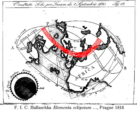 This map was drawn in the book Elementa eclipsium, published in Prague in 1816, by Franz Ignaz Cassian Hallaschka (František Ignác Kassián Halaška) (1780-1847), contained maps of the paths of solar eclipses from 1816 and 1860. The geometric constructions used by Hallaschka anticipated the standard theory of eclipses later developed by Friedrich Wilhelm Bessel.[1]