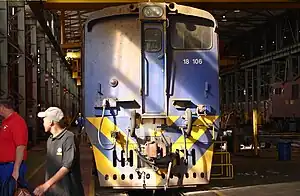 In 2000 Spoornet began a project to rebuild Series 2 to 11 Class 6E1 locomotives to Class 18E, Series 1 and Series 2 at the Transnet Rail Engineering (TRE) workshops at Koedoespoort. In the process the cab at the no. 1 end was stripped of all controls and the driver's front and side windows were blanked off to have a toilet installed, thereby forfeiting the locomotive's bi-directional ability.[7][8]