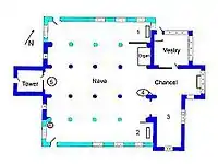 1 St Michael & All Angels Chapel; 2 Lady Chapel; 3 Hastings Chapel; 4 pulpit; 5 Earp font; 6 font