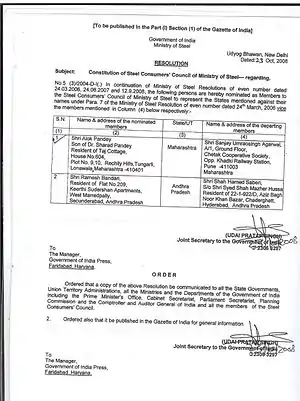 - ↑ "Formation of Steel Consumers Council" (PDF). steel.gov.in. Archived from the original (PDF) on 4 March 2016. Retrieved 14 January 2016.
