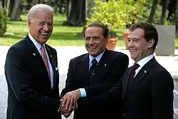 Berlusconi rapidly rose to the forefront of Italian politics in January 1994, forming a new party called Forza Italia.[56][57] He was elected to the Chamber of Deputies for the first time and appointed as prime minister following the 1994 Italian general election, when Forza Italia gained a majority in the Chamber of Deputies less than three months after having been launched.[58] His cabinet collapsed after nine months due to internal disagreements among the coalition parties, and he was succeeded as prime minister by Lamberto Dini.[59] In the 1996 Italian general election, Berlusconi was defeated by the centre-left candidate Romano Prodi.[60] In the 2001 Italian general election, he was again the centre-right candidate for prime minister and won against the centre-left candidate Francesco Rutelli.[61] Berlusconi then formed his second and third cabinets, until 2006. Berlusconi was the leader of the centre-right coalition in the 2006 Italian general election, which he lost by a very narrow margin, his opponent again being Prodi.[62] He was re-elected in the 2008 Italian general election following the collapse of the Second Prodi government and sworn in for the third time as prime minister on 8 May 2008.[63]