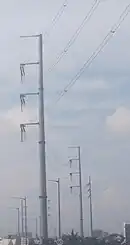 | Anchor steel pole (flag and irregular) | Horizontal dead-end insulators made of 17-22 porcelain discs with 3 horizontal pole-mounted porcelain insulator at the center. When viewed sidewards for the flag variant of the anchor steel pole, the horizontal pole-mounted porcelain insulators resemble the letter "E" while its front side looks like a three-leveled lowercase letter "T" or a cross. Some newer anchor steel poles can have polymer composite dead-end insulator. Irregular variant has 3 horizontal dead-end insulators on a steel crossarm and another 3 arranged in a vertical pattern, has vertical insulator mounted on one side of a crossarm, at the center are 1-2 insulators, and on the pole's top segment is another steel crossarm used to support the overhead ground wire (OHGW) where it is used near the Balintawak and Araneta substations. Newer anchor poles with flag design have 3 horizontal made of 22 porcelain discs and vertical insulators with 21 discs mounted on steel crossarms, with a crossarm at the top segment to support the OHGW. | ||