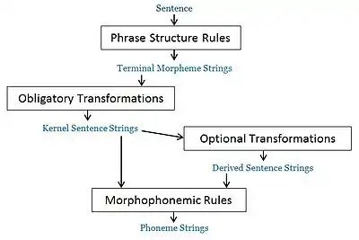Chomsky's transformational grammar has three parts: phrase structure rules, transformational rules and morphophonemic rules.[68] The phrase structure rules are used for expanding grammatical categories and for substitutions. These yield a string of morphemes. A transformational rule "operates on a given string ... with a given constituent structure and converts it into a new string with a new derived constituent structure."[8] It "may rearrange strings or may add or delete morphemes."[69] Transformational rules are of two kinds: obligatory or optional. Obligatory transformations applied on the "terminal strings" of the grammar produce the "kernel of the language".[68] Kernel sentences are simple, active, declarative and affirmative sentences. To produce passive, negative, interrogative or complex sentences, one or more optional transformation rules must be applied in a particular order to the kernel sentences. At the final stage of the grammar, morphophonemic rules convert a string of words into a string of phonemes.[69] Chomsky then applies this idea of transformational rules in the English auxiliary verb system.[70]