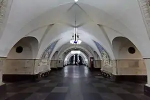 Designed by architects K. Ryzhkov and A. Medvedev, this pylon station was built with the post-war flamboyance in mind, the overall design is based on the traditional Russian motives in decorations. The central feature of the station are 48 maiolica panels located on each face of the pylon. (works of Ye.Blinova, P. Kozhin, A. Sotnikov, A. Berzhitskaya and Z. Sokolova). These contain apart from floral elements, profile bas-reliefs of various World War II Red Army and Navy servicemen each dedicated to a group such as pilots, tank crews, sailors etc. The color gamma is balanced in such a way that the panels facing the central hall are on a blue majolica background, whilst the platform hall panels are monochromatic. Lighting comes from a set of 12 gilded chandeliers in the central hall with the same blue majolica center. The remaining decoration of the station include a cream-colored ceramic tile on the walls, powder colored marble on the lower pylons and also on the walls, and a checkerboard floor layout of black and gray granite.