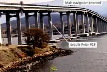 Specialists in marine engineering undertook an extensive investigation to locate bridge debris. This survey took several months to complete, and parts of the bridge weighing up to 500 tons were accurately located using equipment developed by the University of Tasmania and the Public Works Department. Maunsell and Partners were appointed consultants for the rebuilding project. The firm John Holland was awarded the construction contract.[15] Engineers decided not to replace pier 19 as there was too much debris on the site.[16] The Tasman Bridge was re-opened on 8 October 1977, nearly three years after its collapse.[1] The annual expenditures on the Tasman Bridge reconstruction were $1.7 m in 1974–75; $12.3 m in 1975–76; $13.2 m in 1976–77 and $6.1m in 1977–78.[17]