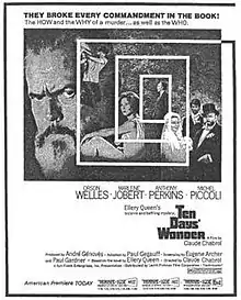 Ten Days' Wonder (French: La Décade prodigieuse) is a 1971 murder-mystery film directed by Claude Chabrol and starring Michel Piccoli, Anthony Perkins, Marlène Jobert and Orson Welles. It is based on the 1948 novel Ten Days' Wonder by Ellery Queen, with the detective renamed Paul Régis. It is the fourth film that Welles and Perkins appear in together after The Trial in 1962.[2]