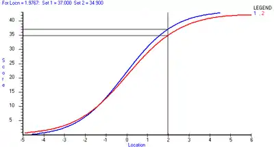 In item response theory, equating[2] is the process of placing scores from two or more parallel test forms onto a common score scale. The result is that scores from two different test forms can be compared directly, or treated as though they came from the same test form. When the tests are not parallel, the general process is called linking. It is the process of equating the units and origins of two scales on which the abilities of students have been estimated from results on different tests. The process is analogous to equating degrees Fahrenheit with degrees Celsius by converting measurements from one scale to the other. The determination of comparable scores is a by-product of equating that results from equating the scales obtained from test results.