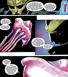 Thane was raised on the ocean planet of Kahje, the homeworld of the hanar, a species known for their strict adherence to polite speech and proper etiquette.[4] A few centuries before the events of the original Mass Effect trilogy, the hanar evacuated a portion of the drell species from their dying homeworld Rakhana and transported them to Kahje.[5] In gratitude to the hanar for saving them from extinction, the remnants of the drell people pledged their loyalty and service to the hanar as a client race, the two races establishing a symbiotic cultural relationship known as the Compact.[6][5] The drell are integrated into every level of hanar society and usually assist with many tasks the hanar may find physically difficult to perform even with mechanical aid, such as combat or assassinations.[6] The drell consider their service to the hanar an honor, regardless of the nature of the task.[7] Thane possesses eidetic memory, a genetic trait typical of the drell species. An external stimulus may trigger an involuntary memory recall, which are so vivid and detailed that some drell may mistake it for reality. Thane occasionally loses himself reliving the perfect recall of some of his memories and can describe them in flawless detail.[8]