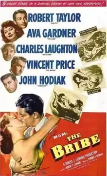 The Bribe is a 1949 American film noir directed by Robert Z. Leonard and written by Marguerite Roberts, based on a story written by Frederick Nebel. The drama features Robert Taylor, Ava Gardner, Charles Laughton, and Vincent Price.[2]