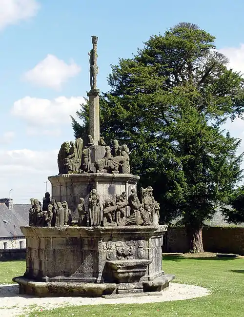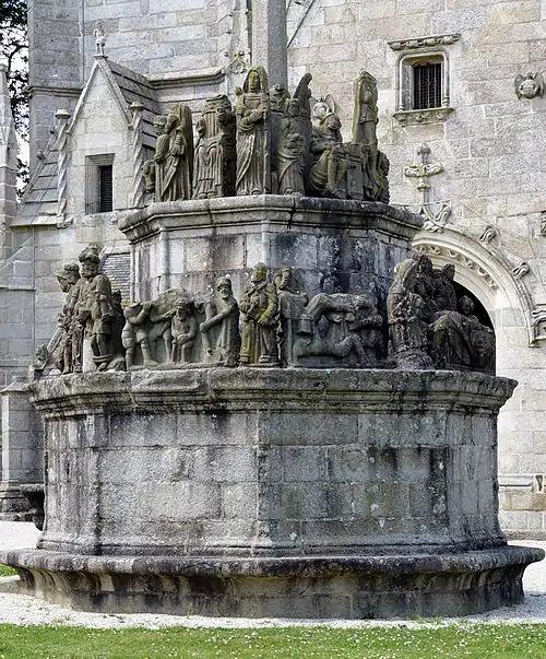 The Notre-Dame church at Kergrist-Moëlou dates back to the early 16th Century and was built by the brothers Guillaume and Pierre Jézéquel. The calvary dates to 1578 and the sculptural work involved is attributed to Guillaume Jézéquel. It was commissioned by the Baron de Pont-l'Abbé to celebrate the recovery of his daughter who was dying but recovered after he had made a pilgrimage to Kergrist to pray for help. In style the calvary is thought to have been inspired by that at Plougonven. It stands in the churchyard and there is an inscription on the west face reading "EN L AN 1578 G. JEZEQUEL." It was restored in the 19th Century but the original order in which the pieces had been arranged was not kept to. The 1922 restoration was carried out after the calvary was declared a "Monument Historique" in 1921, becoming the only calvary in Côtes d'Armor to be given such protection.[1] and another restoration was carried out in 1960. In the Breton language "Kergrist" means the "village of Christ". Several of the statues that survived the 1793 attack are arranged on the upper surface of the pedestal and the others stand on a ledge which runs around the pedestal's lower part.[2][3][4]