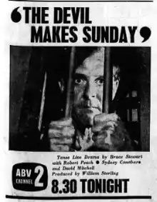 The Devil Makes Sunday is a 1962 Australian television play by New Zealand -born author Bruce Stewart. It was broadcast live from Melbourne, and taped and shown in other cities at a later date.[3]