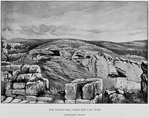 Based on topographical and textual considerations, Conder argued that it would be dangerous and unlikely, from a town-defense point of view, for the walls to have previously been east of the Church of the Holy Sepulchre, concluding that the Church would have been inside the city walls and thus not the authentic tomb of Christ.[27] He instead proposed that the true Calvary was the "rounded knoll" above Jeremiah's Grotto (i.e. Skull Hill). He based this identification on several arguments. First of all, since the Gospel according to John places Golgotha in the near vicinity of a garden and a tomb (John 19:41–42) Conder argued that Golgotha must be close to the necropolis found just north of Jerusalem, near the main road to Nablus, "among the olive-gardens and vineyards of Wady el-Joz". Secondly, Conder proposed that Calvary was the public place of execution and especially noted that Sephardic Jews had regarded the site next to Jeremiah's Grotto as traditionally being a place of stoning, which he saw as corroborative evidence that it was indeed Golgotha. He also pointed to a Christian tradition which associated that general area with the martyrdom of St. Stephen as additional evidence that it was a public place of execution during the New Testament era. Conder actually downplayed the supposed resemblance to a skull which he viewed as immaterial, remarking: "I should not like to base an argument on so slight a resemblance". In his writings Conder refers to Skull Hill by the Arabic name El-Heidhemiyeh which he interpreted as "the rent", and which he proposed was a corruption of El-Heiremiyeh – "the place of Jeremiah".[28][29][12][30] However, later research has shown that the name is actually a corruption of El-Adhamiyeh, named after a zawiya which according to Muslim tradition was founded by the celebrated Sufi saint Ibrahim ibn Adham.[7][31] Charles Wilson spelled the name as El Edhemîyeh.[32]