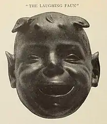 Barnard's plaster model for the sculpture's base featured a rock surrounded by reeds and cattails, with a standing crane to visually balance Pan's head. He also modeled Laughing Faun, a small mask to cover the water spouts around the sculpture's base.[lower-alpha 2] The idea of Pan as a fountain sculpture was abandoned following the Parks Commission's rejection; Barnard's base was never cast in bronze, and the faun masks were not used.[9]