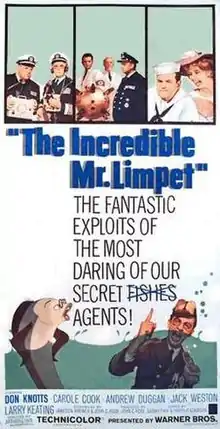 The Incredible Mr. Limpet is a 1964 American live-action/animated comedy film produced by Warner Bros.[1] and based on the 1942 novel Mr. Limpet by Theodore Pratt. It is about a man named Henry Limpet who turns into a talking fish and helps the U.S. Navy locate and destroy Nazi submarines. Don Knotts plays the title character. The live action was directed by Arthur Lubin, while the animation was directed by Bill Tytla, Robert McKimson, Hawley Pratt, and Gerry Chiniquy at Warner Bros. Cartoons. Music includes songs by Sammy Fain, in collaboration with Harold Adamson, including "I Wish I Were a Fish", "Be Careful How You Wish" and "Deep Rapture". The film received mixed reviews. It was the final project for Warner Bros. Cartoons prior to its closure in May 1963.