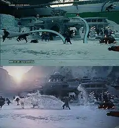 The challenge for fire did not come with making it look realistic, but rather making the fire behave in an unrealistic way that would be believable to the audience.[47] The film that inspired The Last Airbender's fire style was the sixth Harry Potter film, which was re-engineered to reflect two-dimensional simulations.[48] Helman's team referenced images of flames being pushed through the air by giant fans for certain shots needed throughout the film. The team also considered using a meshed image of real and digital fire, but in the end, went with the richer, deeper texture of computer-generated flame.[48]