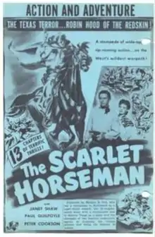 The Scarlet Horseman is a 1946 American Western film serial from Universal Pictures. It is directed by Lewis D. Collins and Ray Taylor. Paul Guilfoyle plays Jim Bannion, secret identity of The Scarlet Horseman, with Janet Shaw as Elise, his love interest. Virginia Christine plays the villainess, Matosca.