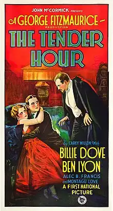 The Tender Hour is a 1927 American romantic drama film directed by George Fitzmaurice, written by Winifred Dunn, and starring Billie Dove, Ben Lyon, Montagu Love, Alec B. Francis, Constantine Romanoff, and Laska Winter. It was released on May 1, 1927, by First National Pictures.[1][2][3]