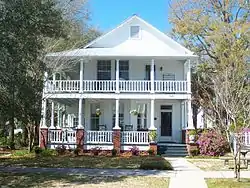 Built in 1889, it was one of two identical frame Florida vernacular houses which stood side by side on Circle Drive. Its twin to the left has since been moved to a different location on the drive. It went through a succession of private owners, some of whom used it as a boarding house for visitors to the DeFuniak Springs Chautauqua. St. Agatha's Episcopal Church, built in 1896 to its right, bought it for use as a vicarage in 1977 using funds given by Violet Horn McLendon of Marianna. The second floor serves as the private quarters of the vicar and family, while the first floor rooms and kitchen are shared with the congregation which use them as its parish hall.[1]