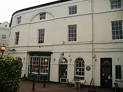 The White Swan was appropriated for a billet by a Troop of the 12th Lancers when the Chartist Trials took place in the Shire Hall in 1840. This event caused great consternation amongst the "respectable folk" of the town who feared a revolution and thought that the Lancers were there to protect them. The hotel continued until the late 1950s, and its lead sign of a swan was still displayed here until stolen some years ago. Now the courtyard provides for a pleasant collection of shops, a coffee house and a cafe bistro. In Church Street, it is worth noting the rather irregular bow window to the chemists by the entrance to White Swan Court, which the poet laureate John Betjeman said "must never be demolished".