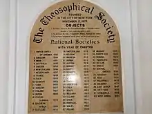 The Theosophical Society is the organisational body of Theosophy, an esoteric new religious movement. It was founded in New York City, US in 1875. Among its founders were Helena Blavatsky, a Russian mystic and the principal thinker of the Theosophy movement, and Henry Steel Olcott, its first president. It draws upon a wide array of influences among them older European philosophies and movements such as Neoplatonism and occultism, as well as parts of Asian religious traditions such as Hinduism, Buddhism, and Islam.[1]